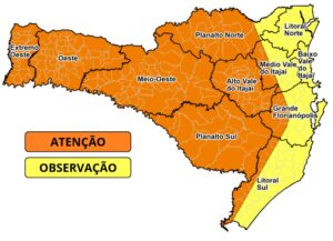 A Secretaria de Estado da Proteção e Defesa Civil de Santa Catarina emitiu um alerta para a possibilidade de temporais entre a noite desta quarta-feira,